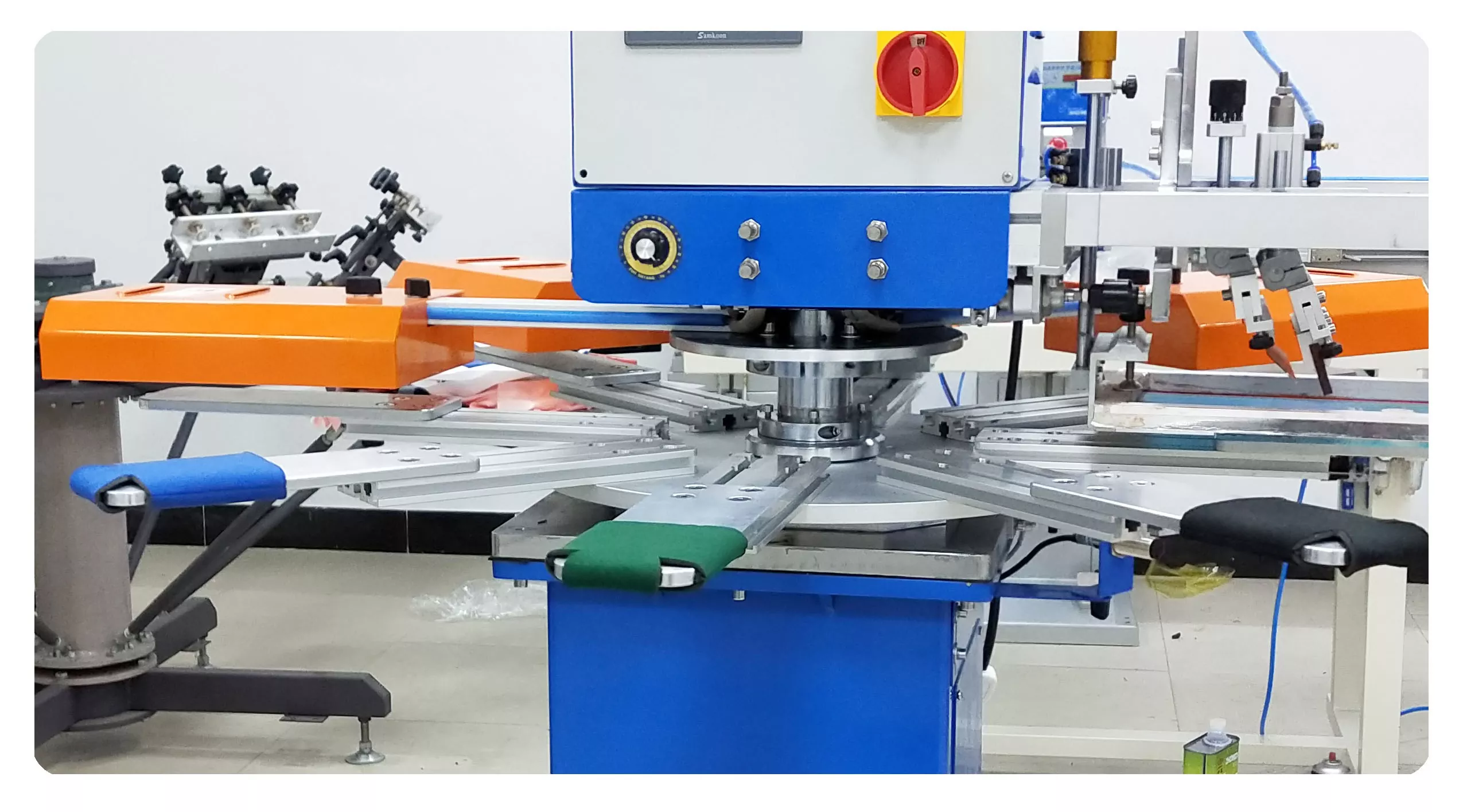 5. Поворотний робочий стіл включає вісім станцій: одну для завантаження, одну для друку, дві для сушіння та одну для вивантаження, що дозволяє п'яти станціям працювати одночасно.