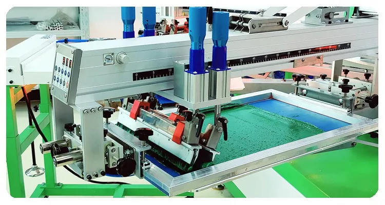 4-кольоровий трафаретний друк на текстильних футболках із ПЛК і сенсорною панеллю, управління інтуїтивно зрозумілим навіть для нових користувачів. Інтерфейс дозволяє легко регулювати швидкість друку, режим друку тощо.