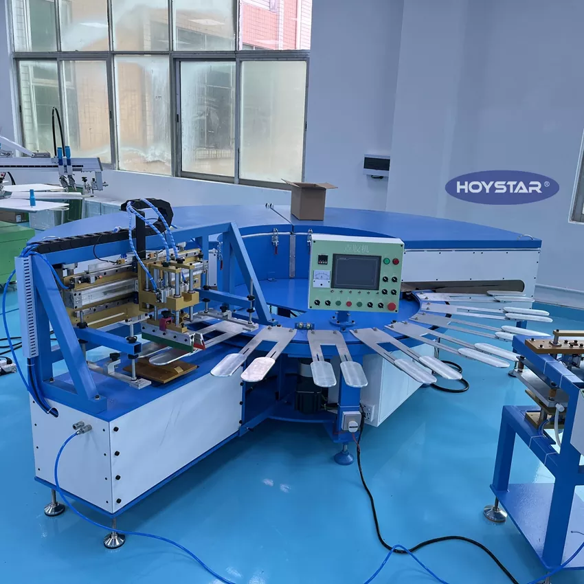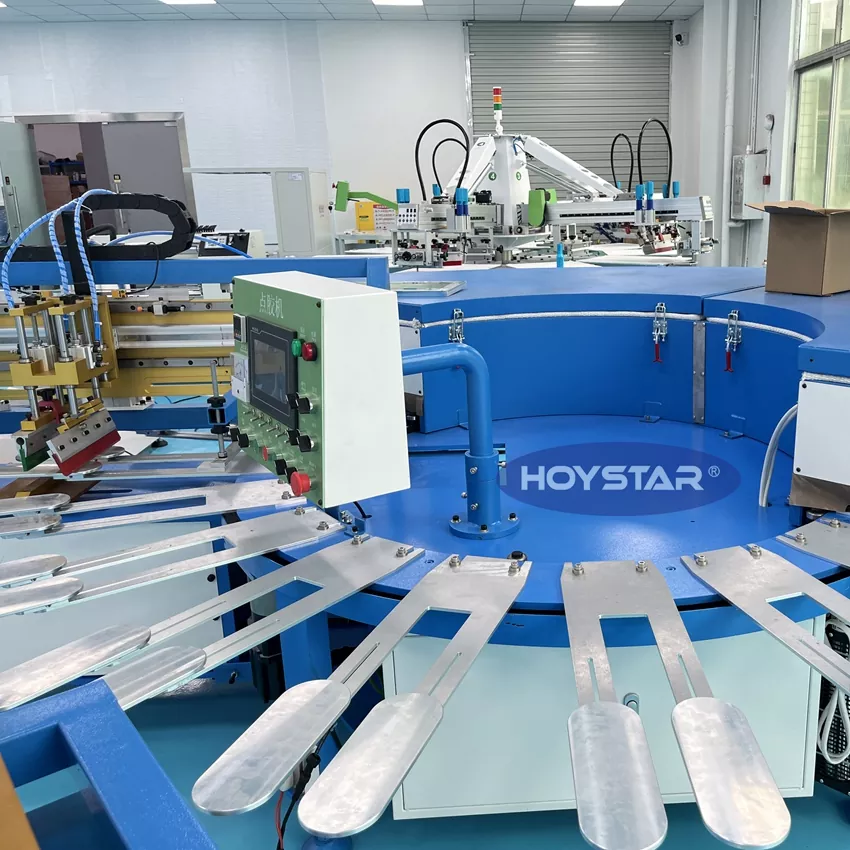 HOYSTAR є надійним виробником і постачальником у Китаї; Ця машина для трафаретного друку протиковзких шкарпеток HOYSTAR High Rapid розроблена для застосування в текстильній трикотажній промисловості. Зі швидкістю до 800-1000 пар/год він підходить для друку нековзких шкарпеток, дитячих шкарпеток, дорослих шкарпеток, футбольних шкарпеток тощо. Оснащений поворотним робочим столом, дуже зручно завантажувати та розвантажувати шкарпетки. Управління сенсорним екраном PLC, дуже просте в експлуатації. Машина, оснащена системою сушіння, може добре висушити кремній і чорнило.