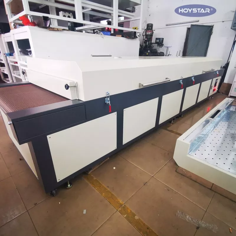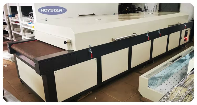 Як професійний виробник у Китаї, ми хотіли б надати вам високоефективну велику інфрачервону сушильну машину з конвеєрною стрічкою HOYSTAR. Підходить для сушіння різних виробів, таких як текстиль, прапори, банери, алюмінієві листи, скло, папір і пластик, після таких процесів, як трафаретний друк, фарбування, нанесення клею гарячого затвердіння, струменевий друк тощо.